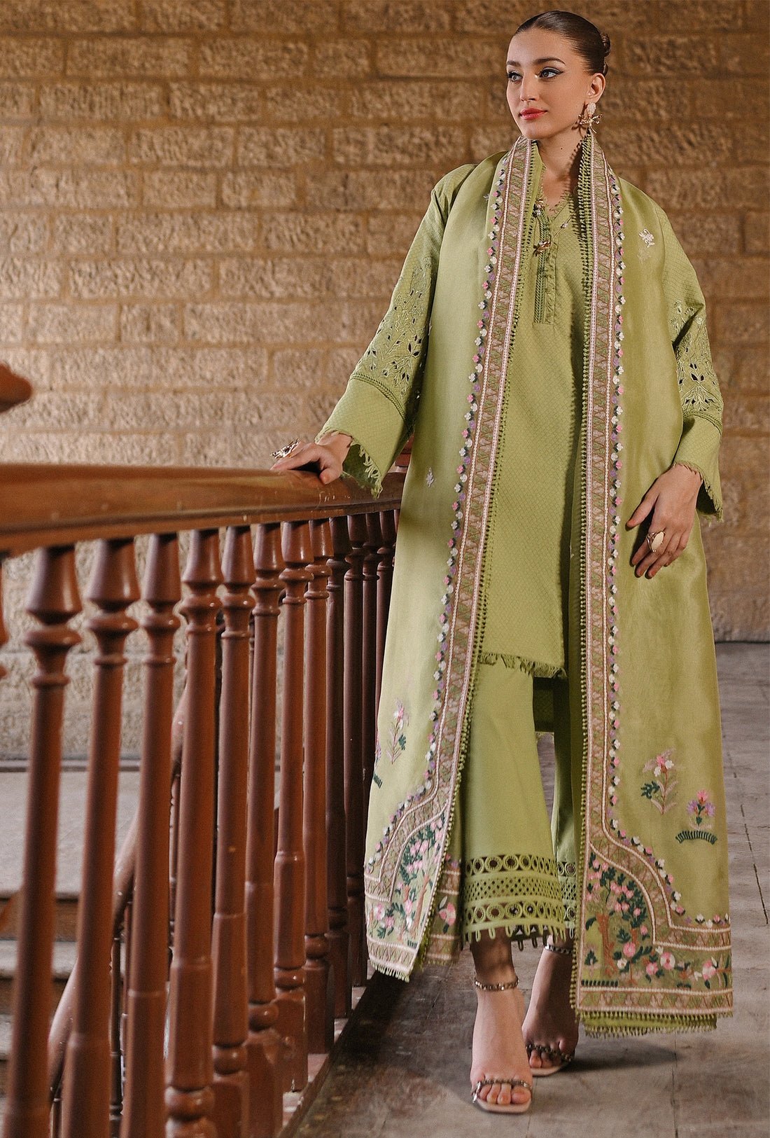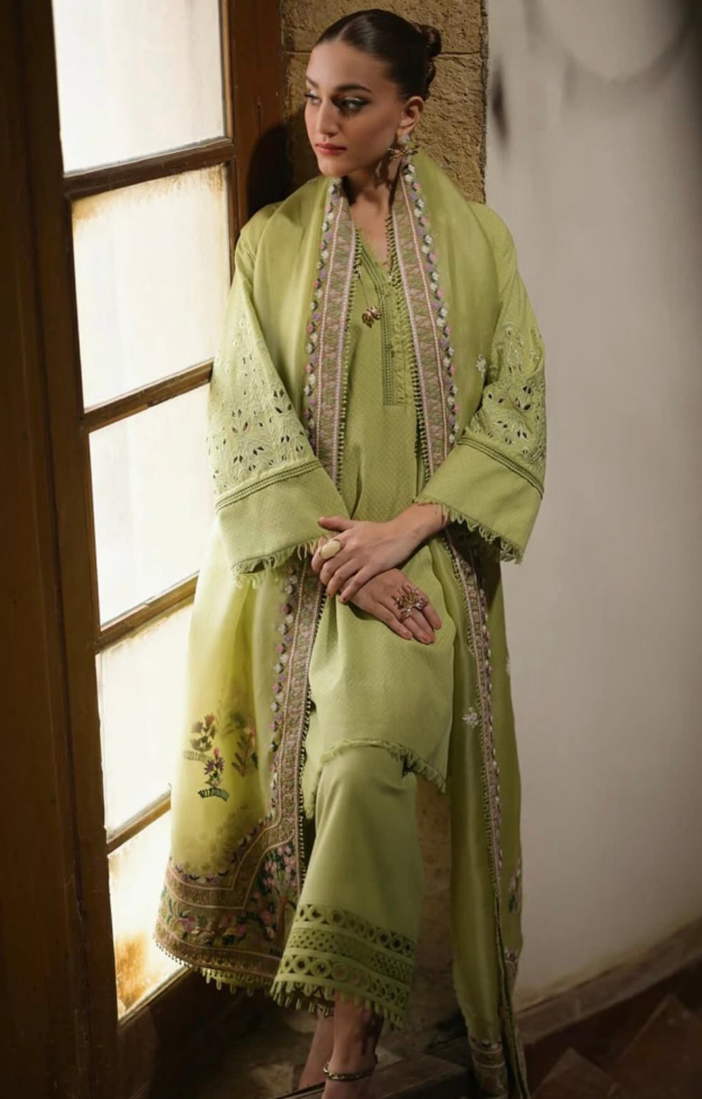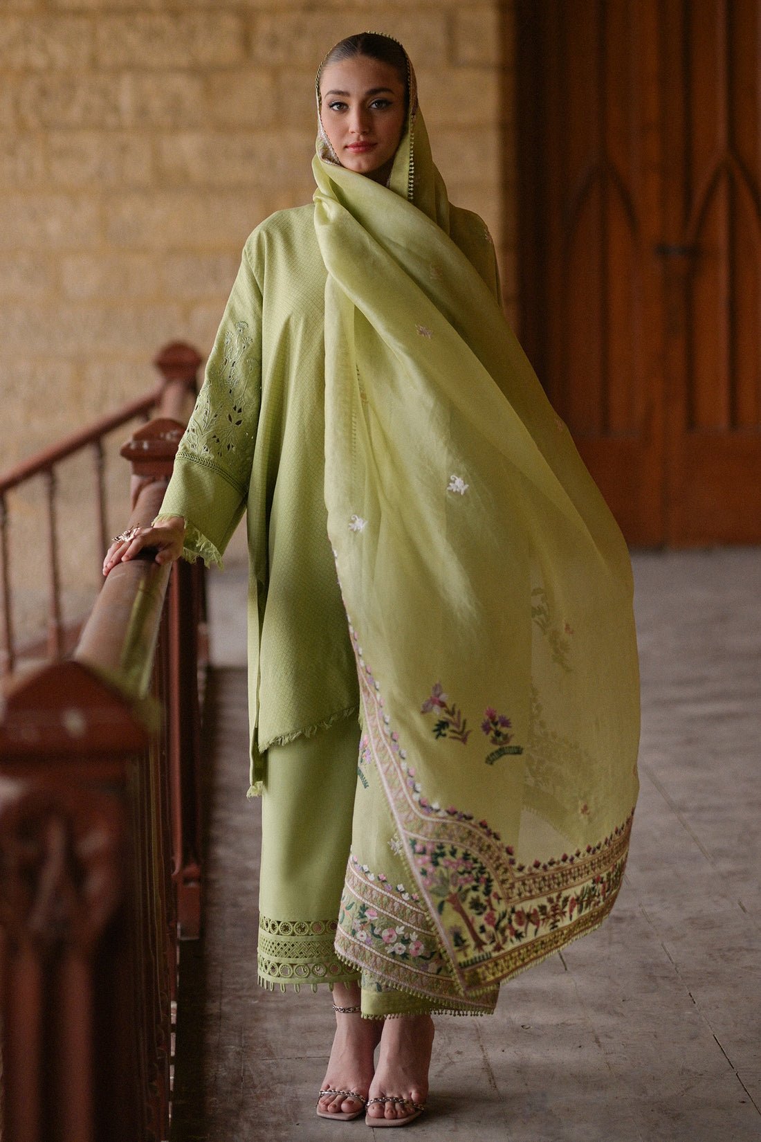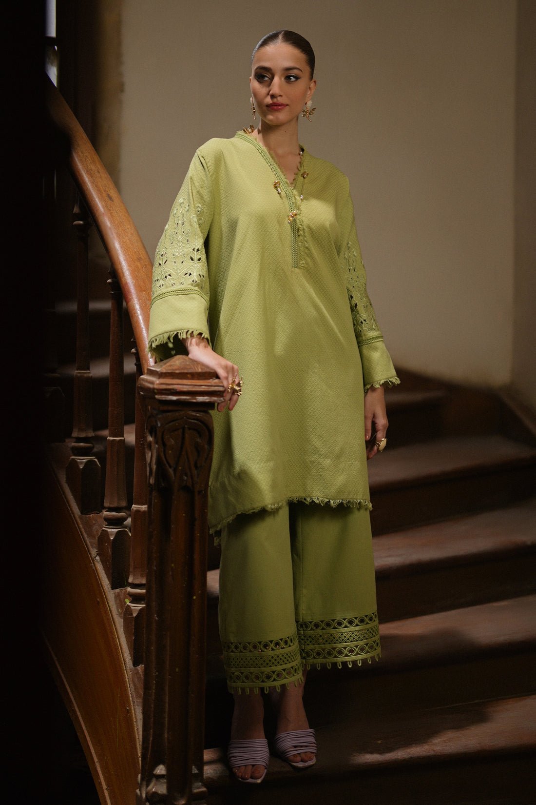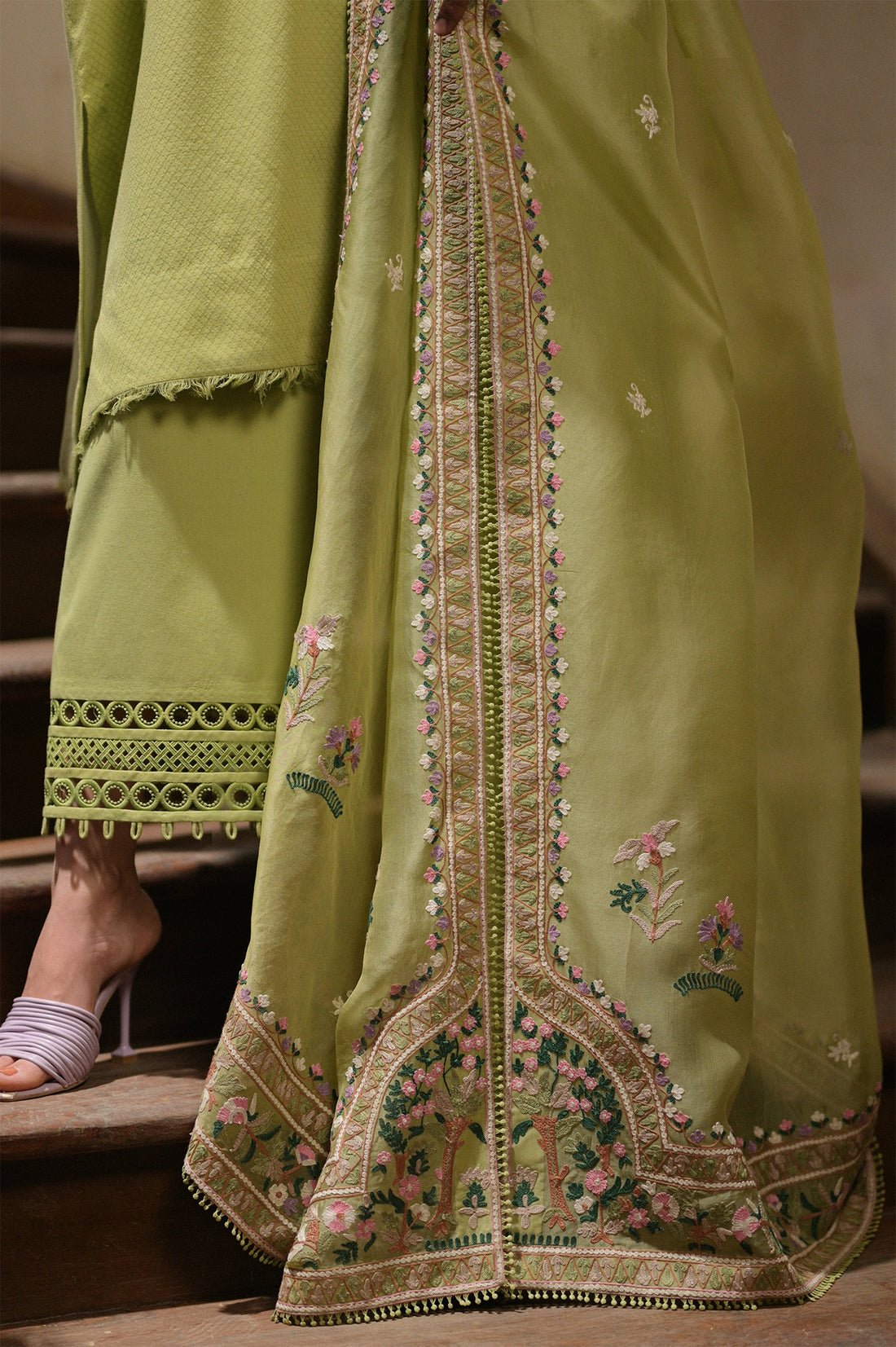 The beautiful pear green shirt has stunning cutwork details on the sleeves, adding a touch of sophistication. The stukish culottes bring a modern and chic element to the outfit. And the embroidered dubata is like a work of art, adding a pop of color and elegance. It’s the perfect outfit for a classy and sophisticated look