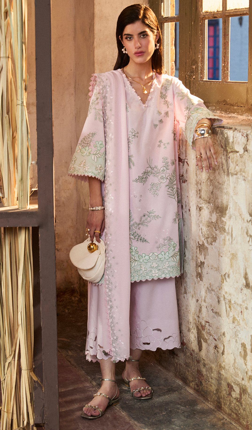 - Pastel pink cotton culottes with self-embroidered cutwork and abstract floral hem detailing. Sarin Nivvi