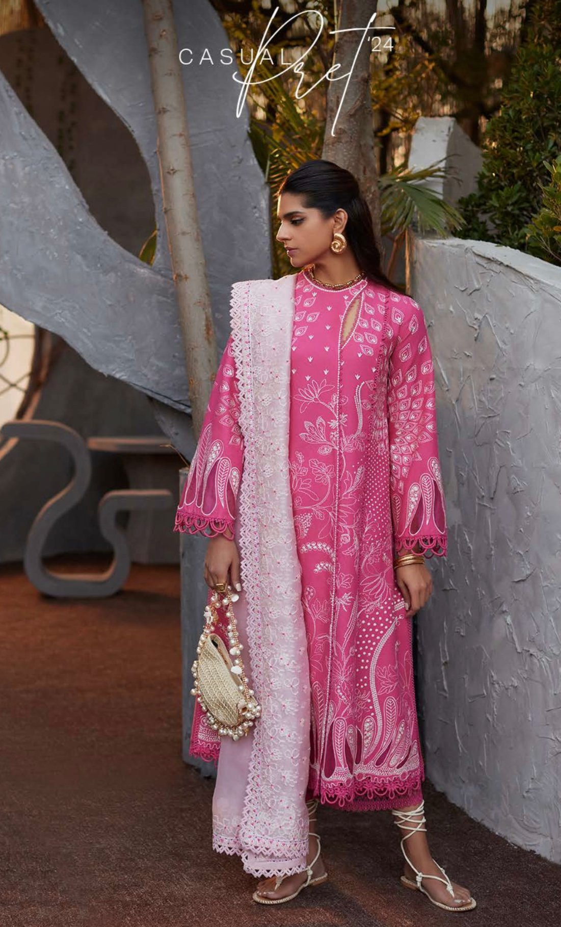 - Candy Pink with front open shirt featuring a contemporary chic neckline. It also includes montone embroidery that complements the contrast.